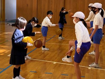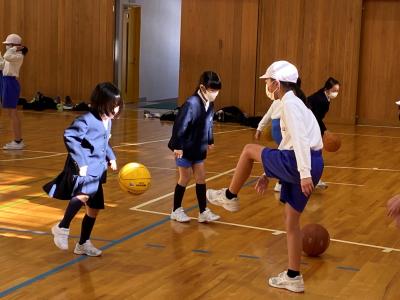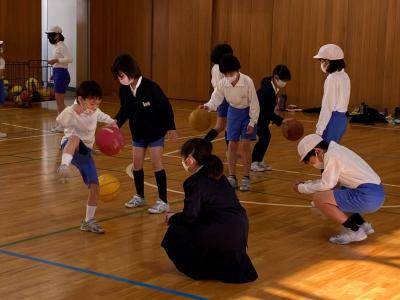 「あんたがた どこさ」では,歌いながらエアーの毬をつきましたが,なんだか今一です。そこで,5年生の体育の授業にちょっとお邪魔して,実際にボールを使った「あんたがた どこさ」の歌と手毬に挑戦!