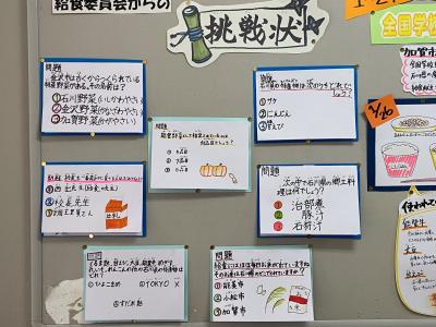 給食掲示板には,「給食委員会からの挑戦状!」と題した,石川県の産物等についてのクイズが出されています。中には,なかなかの難問も・・・