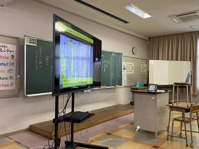モニターには,講師の先生と先生の講話の資料が映し出されています。お話もばっちり聞こえます。他の小学校でも同様です。