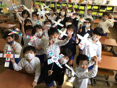 1年生は,生活科の時間に『ふゆをたのしもう』という勉強をしています。寒くて雪があっても遊べる遊び。紙飛行機とばしやたこあげ。いろいろありますが,1年生は,厚紙でかざぐるまを作って遊びました。