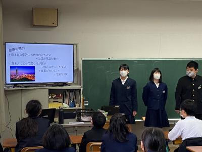 担当する市町の観光名所の写真や地図をGoogleスライドでまとめ,大型モニターで映しながら,「ぜひ行ってみたい!」と思ってもらえるようにPRしました。クイズ形式を取り入れるグループもあり,とても楽しめる発表でした。