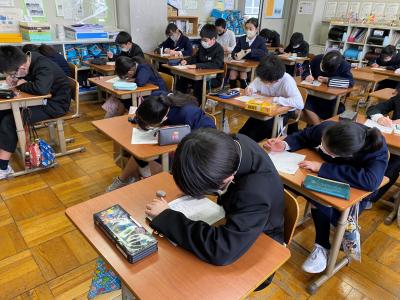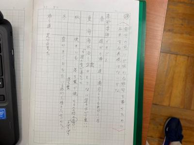 6年生,身の回りから題材を集め,十七音で表そうと頭をひねっています。PCを使って言葉選びをしたり,友だちと話し合って言葉の使い方を考えたり…。ノートには季節ごとの出来事や感じたことをまとめ,十七音で表す世界を広げています。