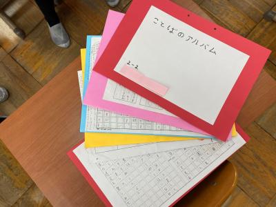 2年生の教室を覗くと,国語の「『ことばのアルバム』をつくろう」の学習で,これまでの国語の授業で作って来た作品をアルバムにまとめていました。こんなにたくさん作品を作ったのですね。