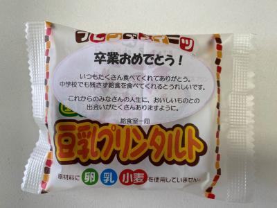 12時少し前,給食の検食が届きました。デザートにイチゴとタルトが付いています。「豪華だなあ~」と思いながら,よく見てみると,タルトに「卒業おめでとう‥‥‥」というシールが貼ってあります。