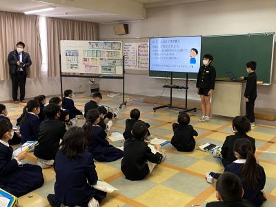 3月18日(木),4年生は社会科の授業で石川県の市町について勉強しました。2~3人のグループに分かれて,各市町の特産品や観光スポット等魅力を調べた結果を3年生に向けて発表しました。