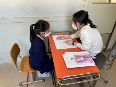 別の場面では,けがをして松葉づえを使っている子に付き添って,保健室へ来てくれた2年生の子を見かけました。松葉づえを使っている子の荷物を持って来てくれたのですが,役目はそれだけではなかったようです。「だって,前から人が来たり,横を人が通り過ぎたりする時に,〇〇ちゃん(松葉づえを使っている子)にぶつかったら危ないから」。なるほど,彼女はガード役でもあったのですね。