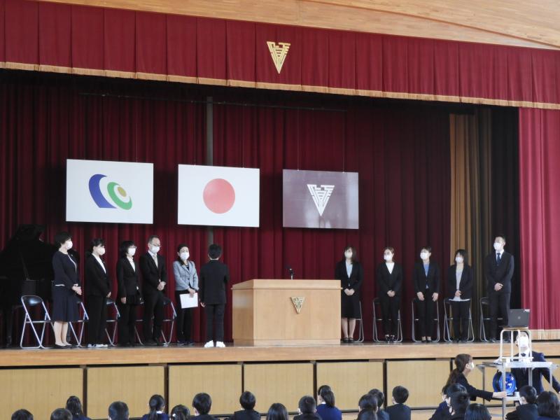 入学式の言葉の練習中だった1年生。体育館にいたので,最後のあいさつをしました。この「背筋ピーン」の姿も見納めです。