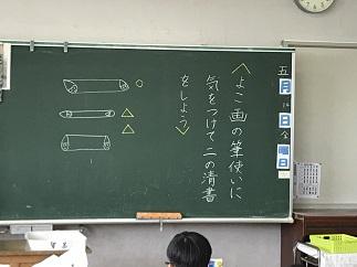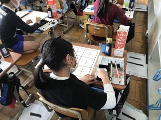 まだまだ慣れませんが、筆の入り方やとめ方に気を付けて作品をしあげていました。最後の片づけも半紙を使って上手にすずりの墨を拭き取っていました。筆を使うのは難しいですが、どんどん練習し上達してほしいと思います。