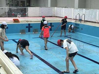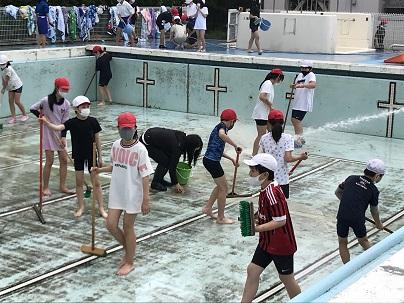 先週、5年生が高学年用と低学年用の2つのプールを掃除してくれました。排水溝を開けて中の泥や葉を取る子、プールの側面をたわしでこする子、底をデッキブラシでこする子、それぞれが役割をしっかりと果たし、きれいなプールに仕上げてくれました。