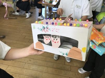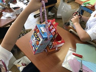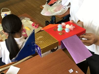 家から持ってきた空き箱を切ったり、はったりして、それぞれの思いで作品に仕上げていました。よく見ると、色紙をはじめビーズやモール、テープ、リボンなどいろいろな材料が準備されていました。みんな紙箱を飾って変身させ、作る楽しさを感じているようです。製作中に教室に入ると、「見て、見て。」とたくさんの子が自分の作品を紹介してくれました。元の形を活かしてよく工夫されていました。見ているだけで楽しい気持ちになりました。