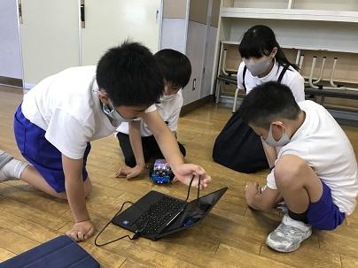 ロボレーブクラブは車を走らせるために、一生懸命プログラミングをしていました。みんな思案中。
