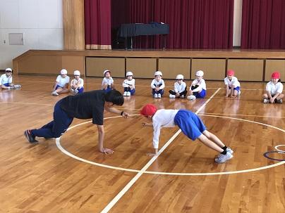 みんなでスクワットポジションの練習です。3年生は初めてなのでちょっと難しそうです。