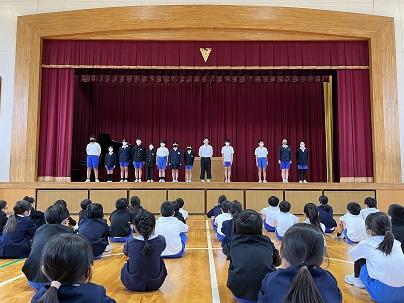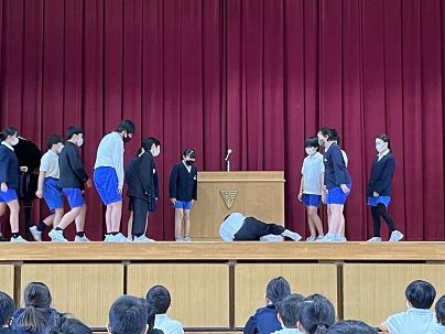 最後に児童会からの発表がありました。内容は生活目標の「友だちのよいところを見つけよう」に関する劇でした。しっかりと練習し、全校の前で堂々と演技してくれました。ありがとうございました。