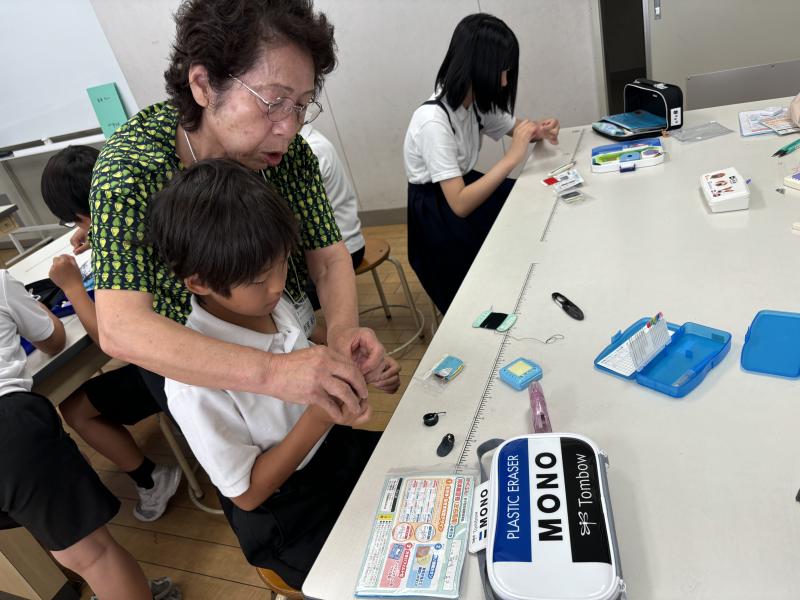 先日、早速5年生のクラスで、家庭科の裁縫を教えていただきました。初めて裁縫を経験する子供たちにとって玉どめや玉結びは、なかなか難しいものです。じっくりと一人一人を見ていただいて、大変助かりました。
