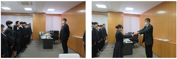 本日12:15より、校長室において激励費授与式が行われました。授与式では石尾校長先生から激励の言葉をいただきました。その後、空手道部と弓道部の代表生徒への激励費の授与、選手代表による決意表明が行われました。