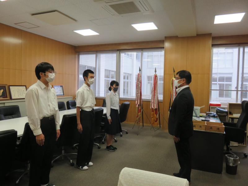前田校長から激励費の交付とともに、期待の言葉と温かい励ましを頂きました。また、女子主将から「夢・きぼう」枠での出場ということで、「貴重な経験ができる機会を得ることができ、大変感謝しています。チーム一丸となってよい結果が得られるように頑張ってきます。」との決意が語られました。