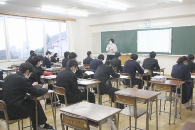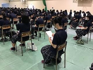生徒たちはマスクを着用し、座席の間をとりながら、段落構成や出題傾向などについて約90分の講演を熱心に聞き、演習を行いました。