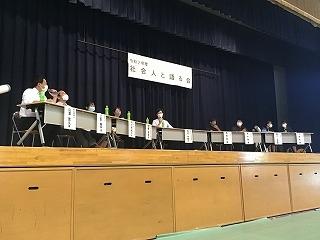 当日は、感染症予防対策のため、体育館にて間隔をとって、お話を聞きました。休憩をはさんでから行われた第二部では、1年生の代表生徒がパネラーとなり、講師の先生方に、高校生活のことや大学生活、職業選択についてなど、鋭い質問を投げかけていました。