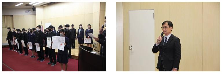 初めに、剣道部・柔道部・吹奏楽部・文芸部・書初めコンクール・英語暗唱コンテスト・読書体験記コンクールについて表彰伝達式が行われ、続いて終業式が行われました。