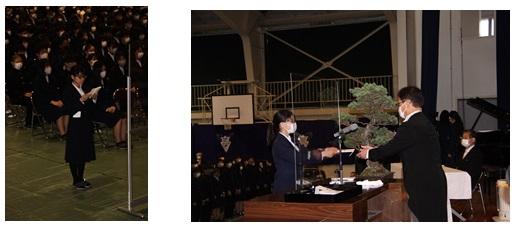 最後に前田学校長の退任式が行われました。学校長はあいさつの中で「桜丘の生徒は素直でよく努力をする生徒だ思います。これからの社会を生き抜くために必要なのは、それに加えてたくましい心と共感力だと考えています。それらをさらに磨いていってください」と生徒に語り掛けました。