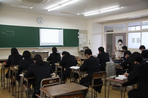2月16日(水)7限目に、3年担任の先生方による、「2年生に語る会」が各クラスで開かれ、前後半で2名の先生方からお話を聞くことができました。3年生は1月の共通テストやその後の私立大学入試を経て、いよいよ2月25日(金)から国公立大学入試前期日程が始まります。その3年生の「リアルタイムな現状」や「心構え」、「今のうちにすべきこと」、「真の受験勉強とは」などなど、生徒達はメモをとりながら集中して真剣に聞き入り、刺激を受けていました。
