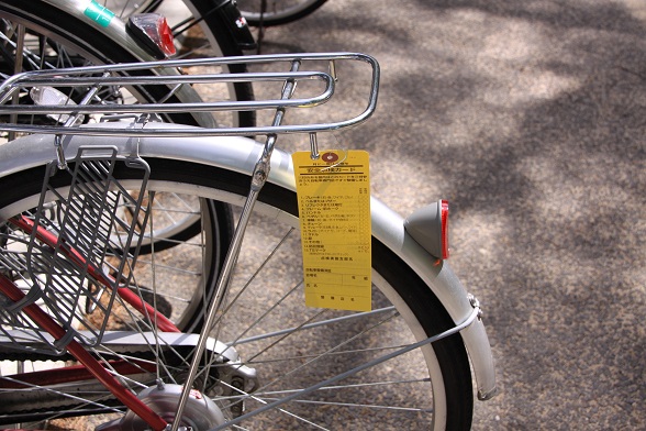 自転車組合の方に自転車の安全点検を行って頂きました。1台1台点検・確認し、ライトが点かない、ブレーキの利きが弱い、チェーンにゆるみがあるなど整備不良のものには安全点検カードを付けていきます。整備不良の自転車は早急に直し、交通規則・マナーを守って事故が起こらないように注意しましょう。