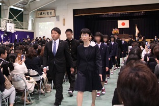 引き続いて全国大会に向けた壮行式、野球部の県大会壮行式が実施されました。応援団が勢いよく入場し、続いて全国大会出場選手、野球部が入場しました。