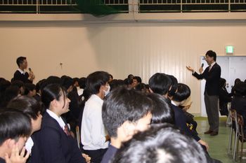 松村さんは、さすがに長年ニュース番組のメインキャスターを務められただけあって、非常に滑舌が良く、ところどころ、笑う場面もあり、生徒は松村さんのお話と話術にすっかり魅了されていました。お話の後には、生徒から松村さんに質問が相次ぎ、丁寧に一人ひとり答えていただきました。講演会の後には、生徒会や新聞部の生徒と交流会を行い、金沢桜丘高校の大先輩と語ることができ、自分の夢の実現に向けて、大いに励みになったようです。