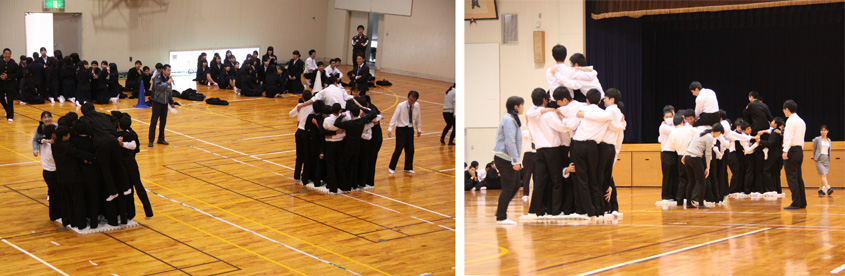 入学したばかりの生徒たちの緊張を和らげ、友人たちと早く打ち解けてもらうために、クラス対抗のゲームを行いました。