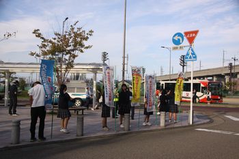 9月24日(火)の放課後、金沢東警察署が実施する「自転車ヘルメット着用啓発キャンペーン」に放送部が参加しました。東金沢駅前広場に設置された機動隊指揮官車の上で「高校生DJポリス」として自転車ヘルメット着用や自転車の鍵かけなどにつてい呼びかけました。また、通行する人たちに「ちゃりしばレフレクター」などを配布しました。