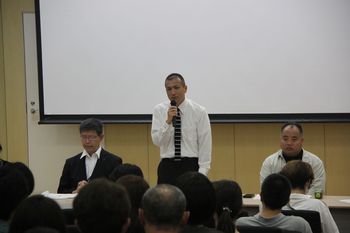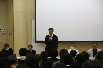 全体会では、室屋PTA会長・梅本学校長の挨拶の後、放送部が制作した昨年度の3S歩行の動画を視聴し3Sの様子を見ていただきました。続いて総務課長が概要説明を行い、最後に林PTA副会長さんのご発声の下、参加者全員で「頑張ろう」を三唱しました。その後、各分科会に分かれ業務内容の説明を行いました。