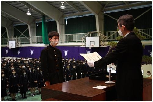 表彰伝達式及び2学期終業式がリモート方式で行われました。表彰伝達式では県新人大会で優勝した剣道部をはじめとして5つの運動部と6の文化部と個人参加(将棋)での入賞、読書感想文、高校化学グランプリの表彰がありました。