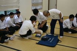 まず、救急車が到着するまでの処置が生存率に大きくかかわってくるという説明を受けたました。引き続き心配蘇生の方法を聞き、胸骨圧迫と人工呼吸を訓練人形を使って練習しました。その後AEDを実際に使った練習もしました。最後に熱中症の対処法についても学び、講習を終了しました。