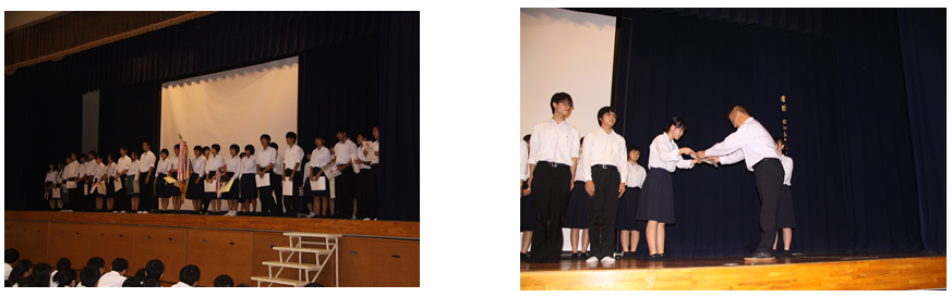 表彰伝達式では、各部の代表者が表彰披露をしながら、全員の生徒の活躍を報告しました。
