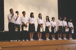 生徒会役員認証式では、生徒会長をはじめとする生徒会役員それぞれが、「明るい挨拶が増えるように挨拶運動を行いたい」「被災地を応援する募金活動を行いたい」などの所信を表明しました。表彰伝達式では、表彰披露しながら、生徒の皆に活躍を報告しました。