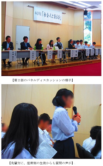 第2部では、代表生徒4人がパネラーとして加わり、ディスカッション形式でいろいろな質問をし、先輩方に答えていただきました。気さくで温かな、でも仕事においては真剣な先輩方の姿に、1年生は「社会人になるってこういうことだとよくわかった」と口々に感想を話していました。