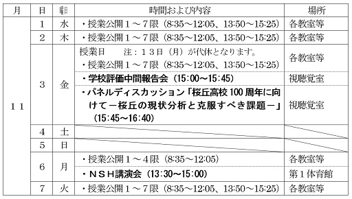 11月3日(金)に保護者の皆様を対象として、「学校評価中間報告会」及びパネルディスカッション「桜丘高校100周年に向けて」を予定しておりますのでご案内いたします。