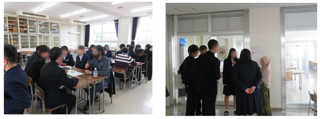 生徒たちは8グループに分かれ、留学生に校内を案内(スクールツアー)し、校舎や学校生活について紹介したりしました。その後、互いの文化の違いについてまとめ、制服や内履き、部活動など、日本と外国との高校生活の違いについて英語で発表をしました。お互いの文化の違いについて、さらに、どうして日本で勉強しようと考えたのか、自国に戻り何をしたいのかといった生き方についても知ることができ、楽しく学ぶことができました。