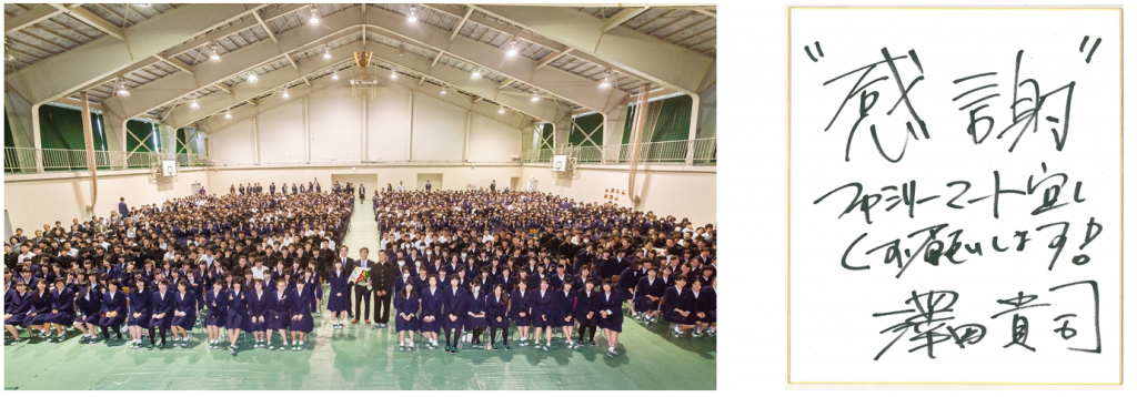 また、現在手掛けているファミリーマートでの「未来のファミマ」をテーマにLINEなどのIT企業との提携など今後の新しいコンビニのスタイルなどの話もしていただき、最後に本校生徒に向けて色紙を書いていただきました。