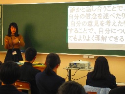 | 【他者理解が自己理解の第一歩と話す青木先生】 | 【クイズ形式で生徒自身に問いかける樋口先生】 | |