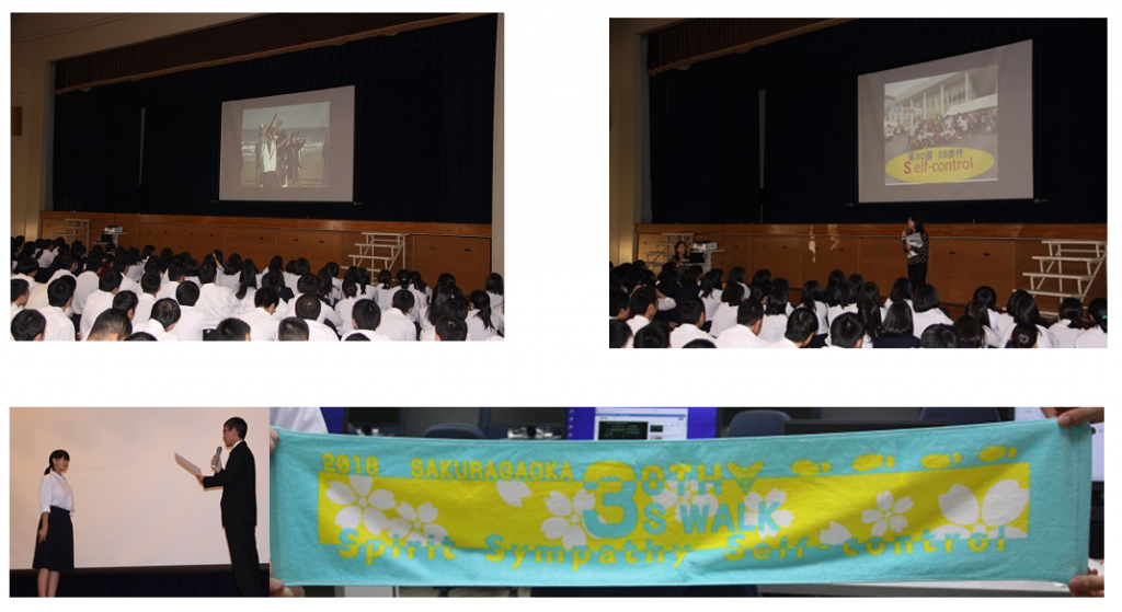 3S歩行の集会では、今回は台風24号の影響が考えられるため、高松SA付近の浜辺をスタート地点とする、各関門の閉鎖時間を変更する、などの変更があり、間違えることのないように注意がありました。また、3S歩行未体験の1年生のために昨年の様子を記録したDVDが上映され、1年生だけでなく2・3年生も昨年を思い出しながら、食い入るように見つめていました。その後、養護教諭から、体調管理に十分注意を払うようにし、完歩を目指す秘訣などの話がありました。