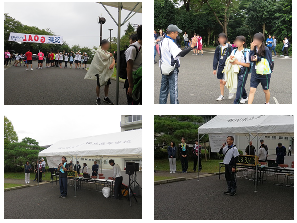 生徒たちが続々とゴールしています。頑張って走ってくる生徒や、仲間同士で励ましあいながらゴールをする生徒など、笑顔で溢れています。