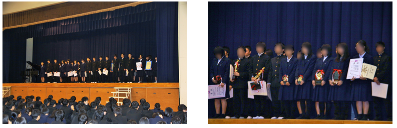 第一体育館に移動し、表彰伝達式・終業式を行いました。表彰伝達式では全国総体・総文祭の他、国体・県新人大会などで好成績を修めた部活動が披露されました。