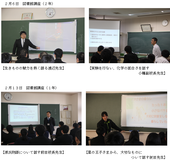 2月6日に2年生を対象に、2月13日に1年生を対象に「図書館講座」が開催されました。先生方に講師を依頼して、読書体験やお薦めの書籍について、各教室で話してもらっています。生徒の知的好奇心を高め、読書意欲の向上を図る一助となっています。