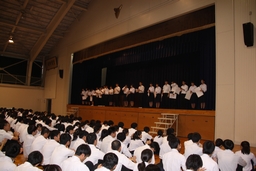 本校第一体育館において、表彰伝達式の後、1学期終業式及び離任式が行われました。