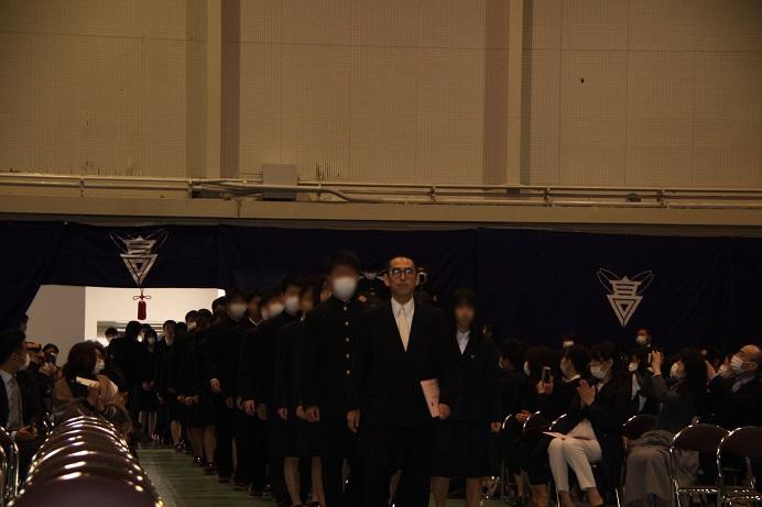 【卒業生入場】1年間お世話になった担任の先生に導かれての入場です。