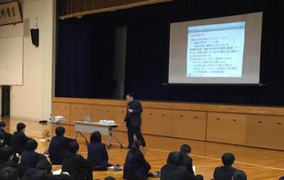 講師は9月の2年保護者進路説明会でもお世話になった富山大学教授の船橋伸一先生です。先生には、経済学の観点から大学選びのポイントをわかりやすく解説していただきました。