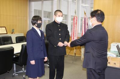 北信越高等学校剣道新人大会に出場する男子剣道部と女子剣道部に、激励費の授与が校長室にて行われました。