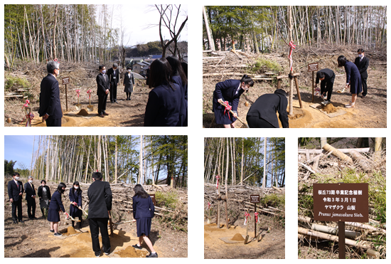 令和2年度卒業記念植樹式が行われました。本年度(第73期)卒業生を代表して、同窓会クラス幹事が集まり、「山桜(やまざくら)」を植樹しました。