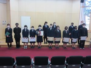 初めに、剣道部・柔道部・吹奏楽部・文芸部・書初めコンクール・英語暗唱コンテスト・読書体験記コンクールについて表彰伝達式が行われ、続いて終業式が行われました。